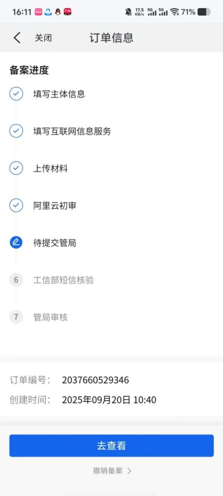 9月20日16:11 阿里云备案人员打电话,阿里云初审通过
